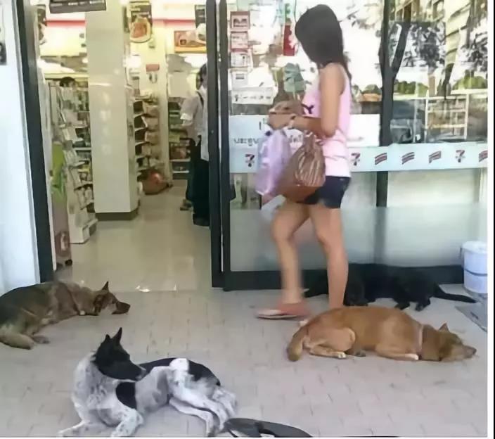 地處熱帶的泰國常年氣候炎熱,在那經常可以看到這樣的畫面:流浪動物們橫七豎八地躺在超市門口,享受著店內的空氣,一點也不怕人。